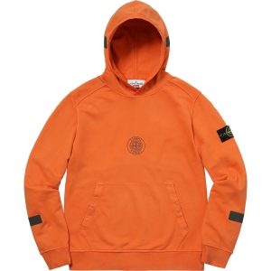Garment dyed cotton fleece with snap closure pouch pocket. Reflective print on chest and lower sleeves with removable Stone Island® badge on left sleeve. Made exclusively for Supreme.