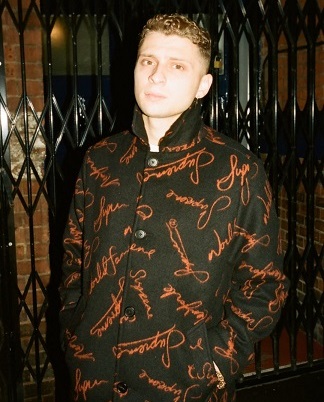 Wool blend with jacquard logo pattern and viscose blend quilted lining. Button front closure with welt hand pockets at lower front and interior chest pocket.