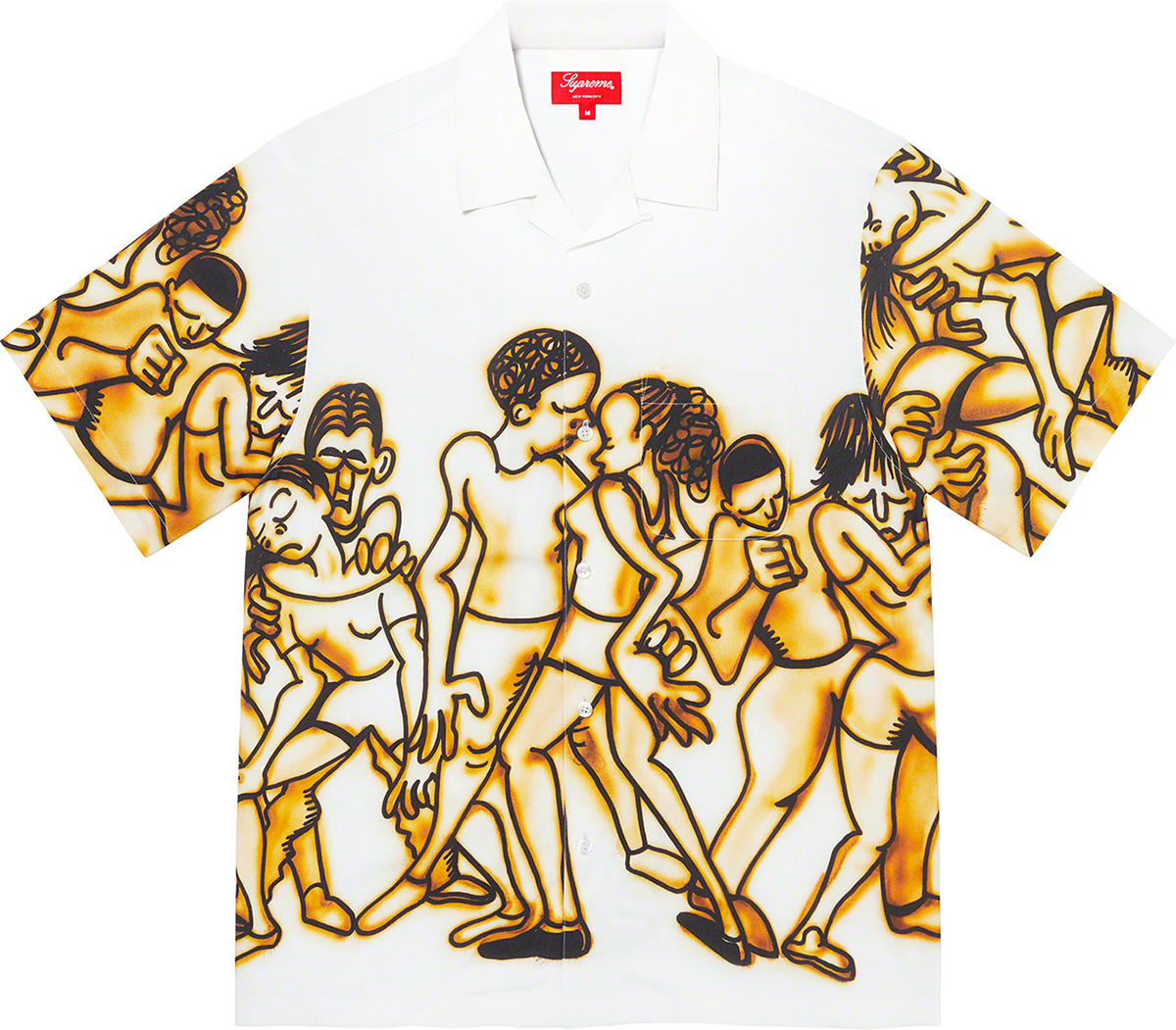 ダンスを踊る人々が総柄で描かれた、レーヨン素材の開襟シャツ。