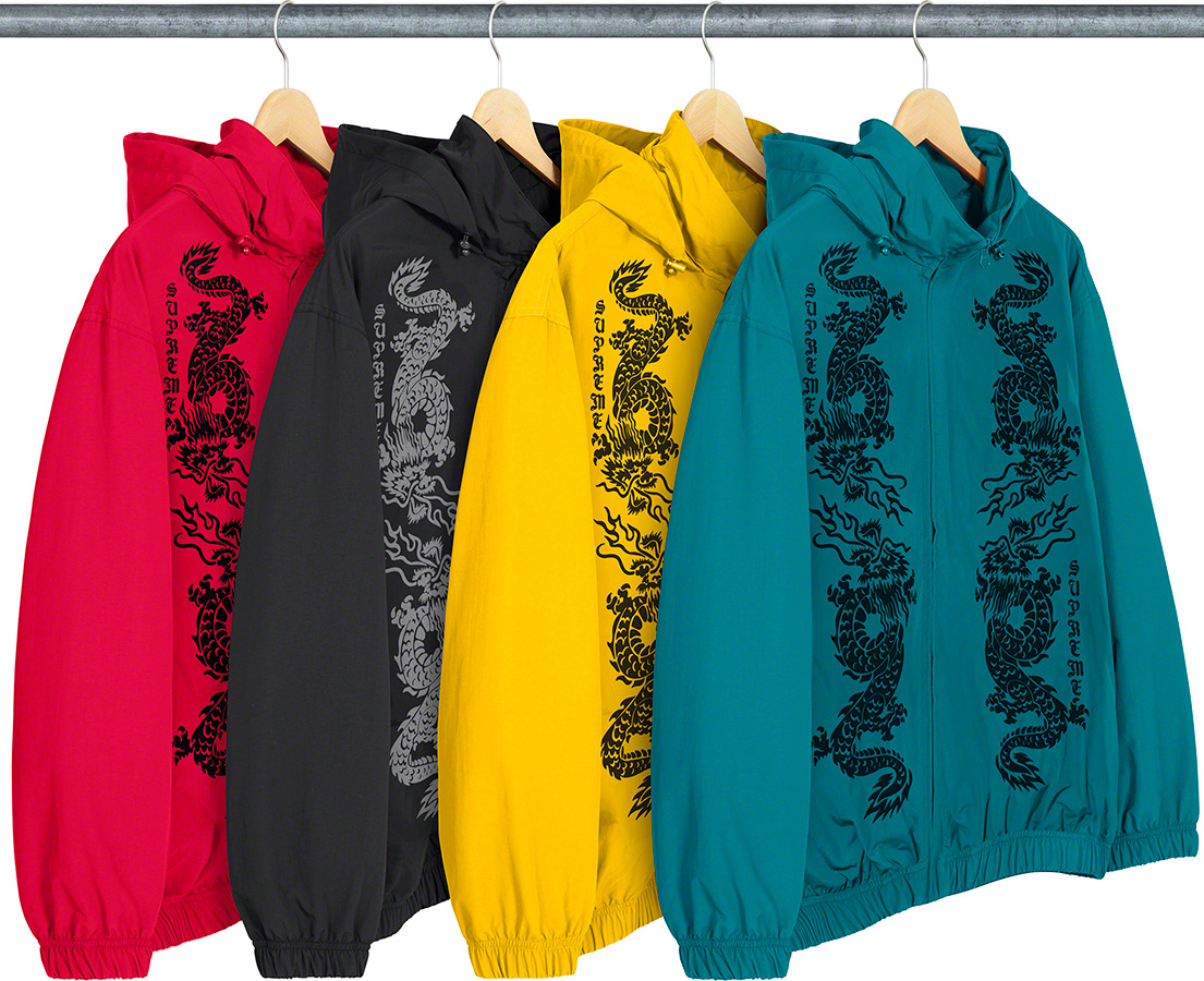 炎を吐くドラゴンが、フロッキー加工のプリントで描かれた、撥水加工のサプレックスナイロン素材のトラックジャケット。フードを襟に収納することが可能。