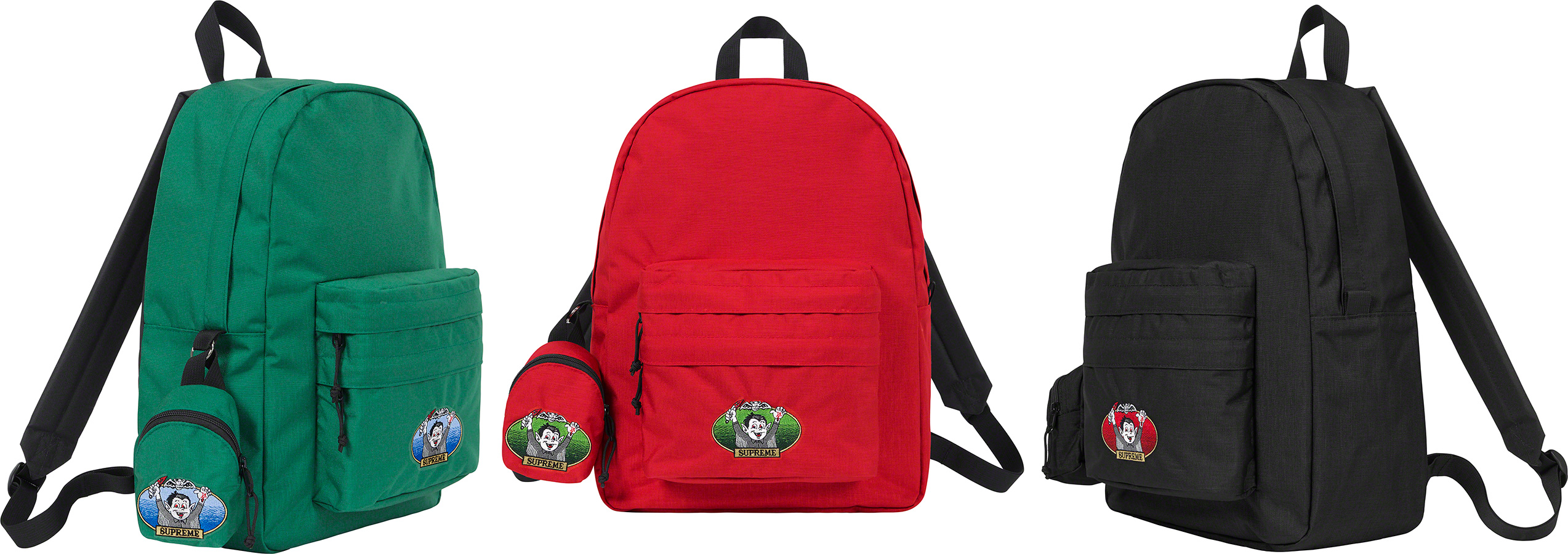 子供の吸血鬼のイラストがポケットに刺繍で描かれた、500デニールコーデュラファブリックのリュックサック。サイドにミニリュックが付属する。18リットル容量サイズ。