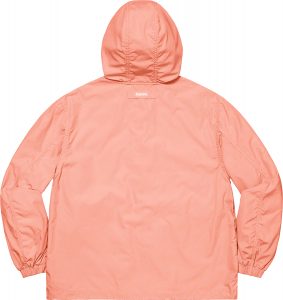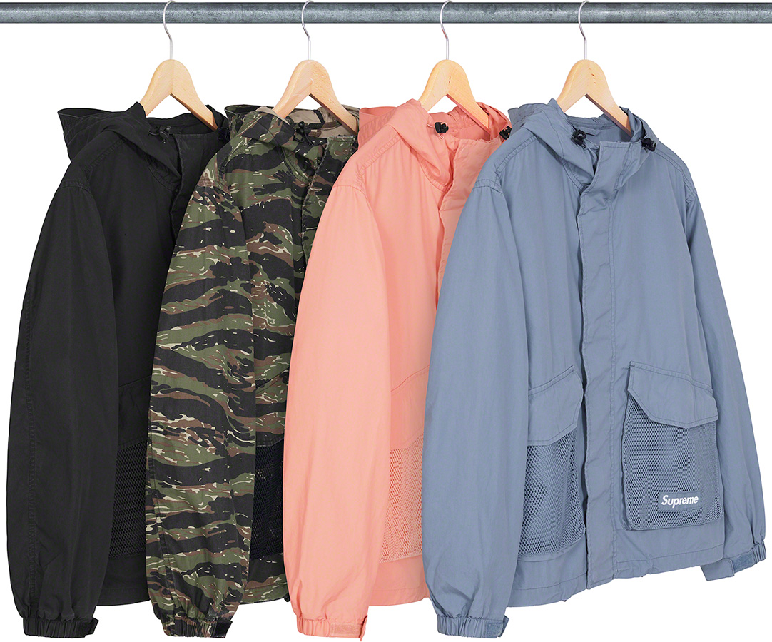 メッシュ素材の大きなカーゴポケットが2つ付いた、撥水加工コットン素材のジップアップフードジャケット。ポケットにはボックスロゴ。