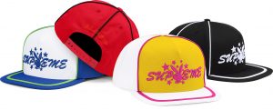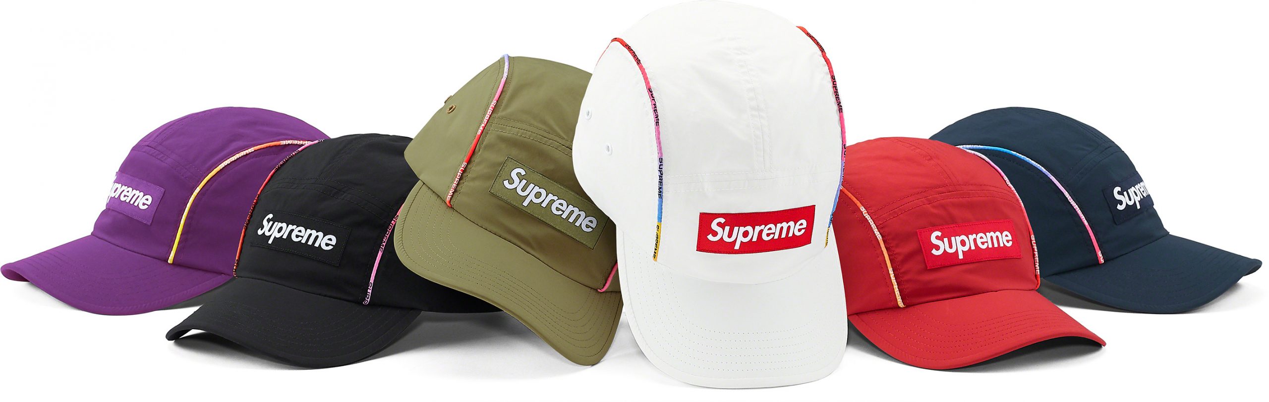 サイドパネルの継ぎ目を、「シュプリームロゴ」がデザインされたカラフルなテープでパイピング加工したキャンプキャップ。