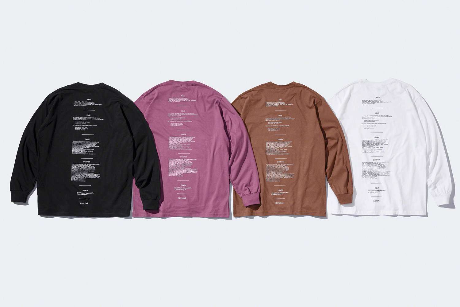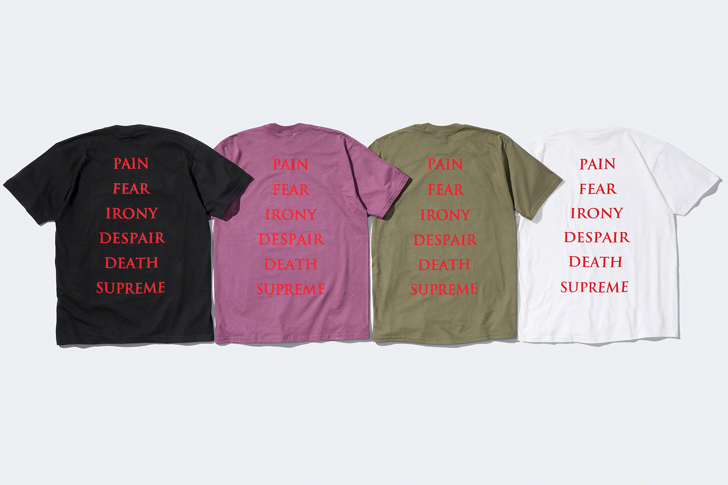 「痛み・恐れ・皮肉・絶望・死・最高」のテキストが入った、ワークシャツ。