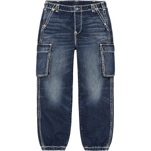 目の粗いステッチが特徴的なデニムカーゴパンツ。ポケットには「馬の蹄鉄」のブランドトレードマークをデザインステッチしている。