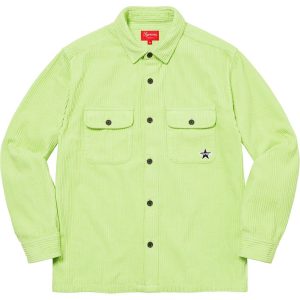 フラップ付きのダブルポケットの一方にシュプリームの「スターロゴ」を刺繍した、コットンコーデュロイ素材のシャツ。裾は一直線のスクエアカット。