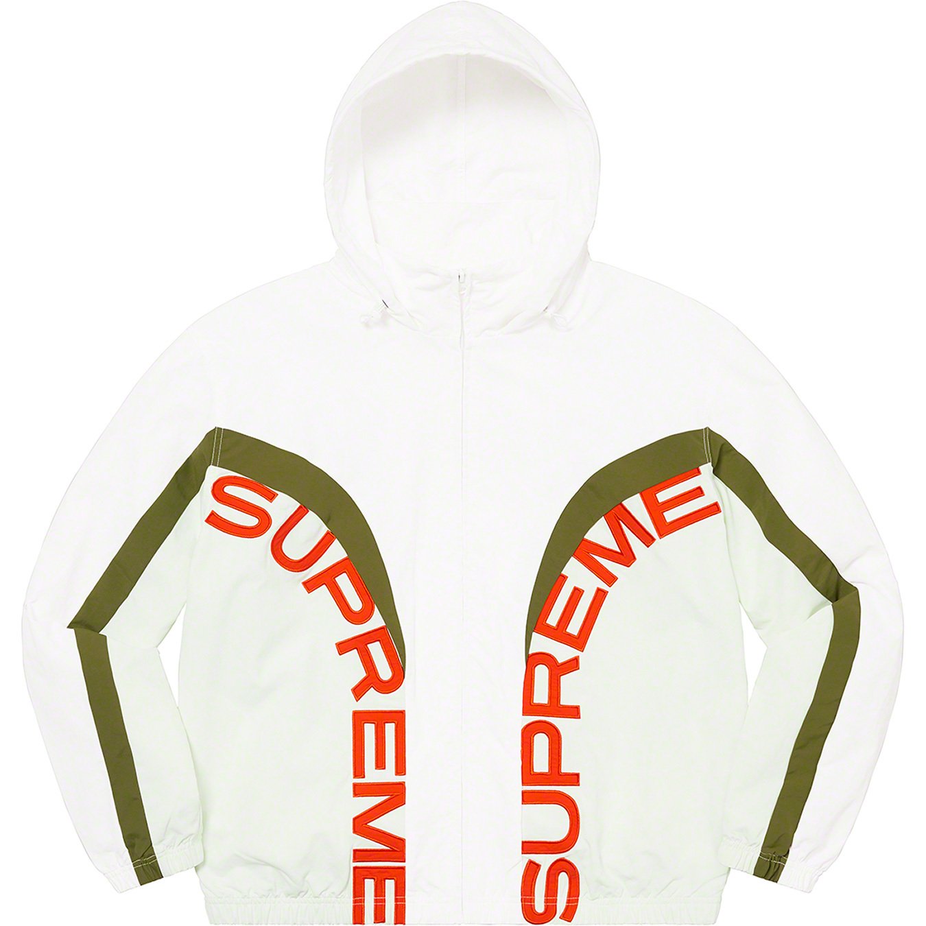 切り替えラインの縫い目に沿ってシュプリームロゴをデザインした、サプレックスナイロン素材のトラックジャケットとパンツ。