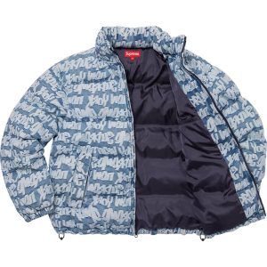 タギング文字で「SUPREME NEW YORK」とジャカード織でリピートしたコットンデニム素材のパフィージャケットと、14オンスデニム素材のレギュラージーンズ。
