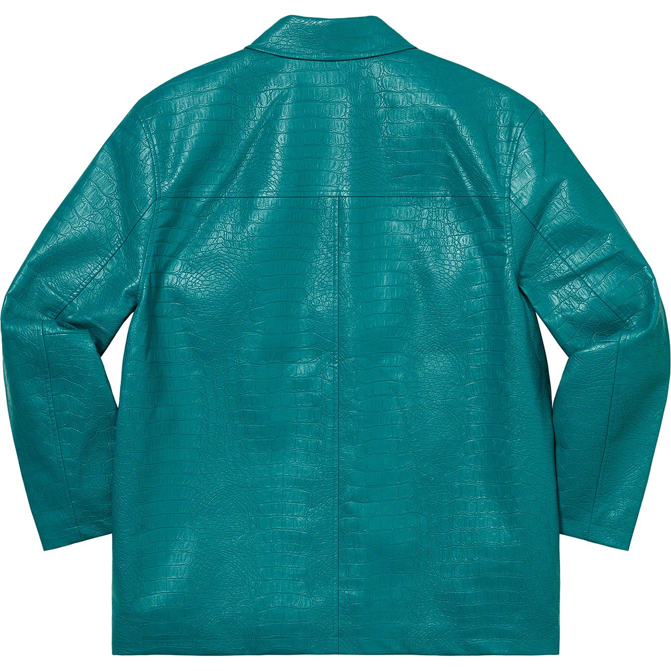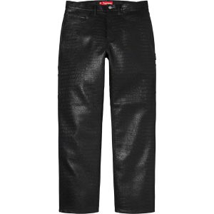 クロコダイル柄を型押ししたフェイクレザージャケットとペインターパンツ。裏地はジャカード織でシュプリームロゴをリピートしたビスコースライニング。