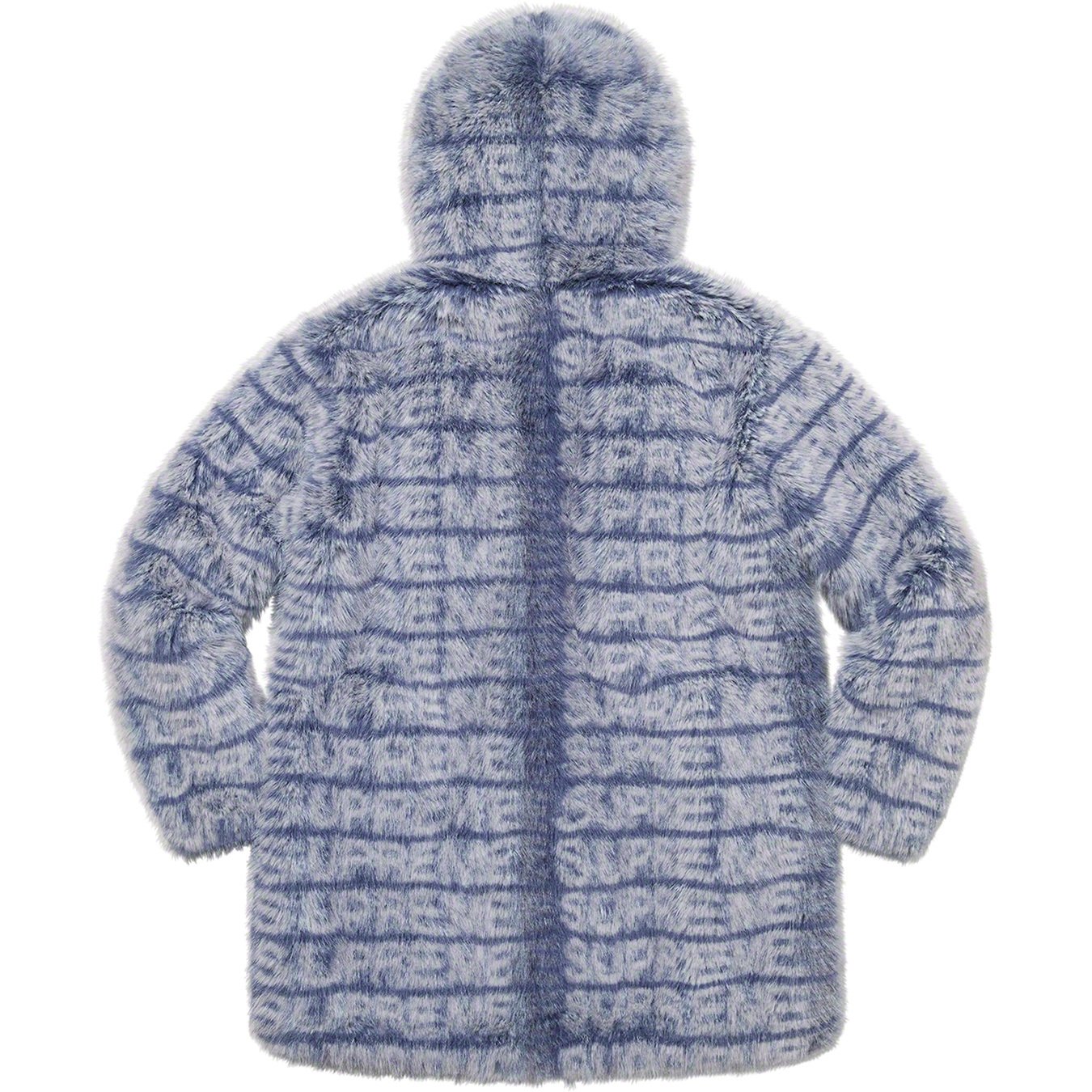 シュプリーム公式インスタグラムのティーザームービーで着用していた、シュプリームロゴをリピートパターンでプリントした、スナップフロントのフード付きフェイクファーコート。