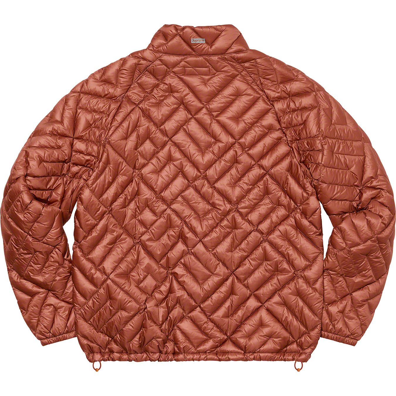 シュプリームのスペルに見立てて縫い目を切り替えた、パーテックスナイロン素材のライトウエイトダウンジャケット。