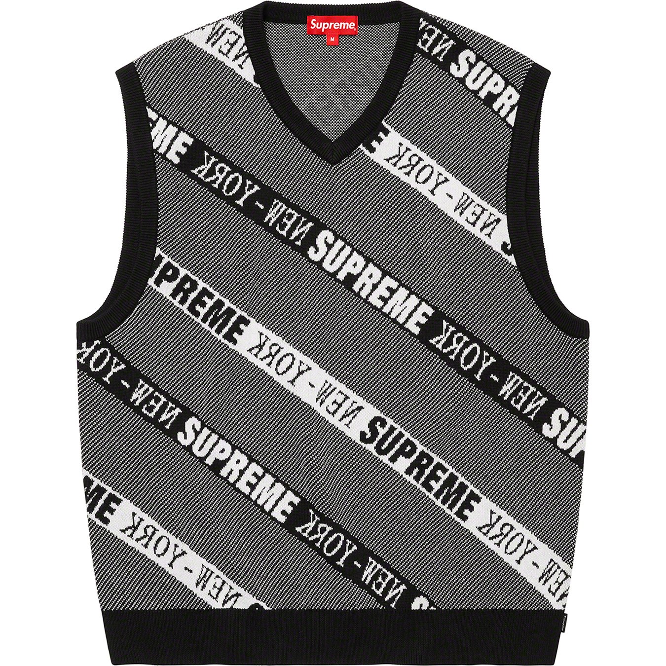 バイヤス方向のストライプに「SUPREM NEW YORK」のロゴを編み込んだ、コットンニット素材のVネックベスト。