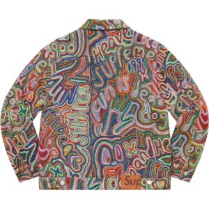 メキシコ出身のアーティスト「ラウル・デ・ニエベス」によるアートワークを、カラフルなステッチワークで落とし込んだデニムジャケットとジーンズ。