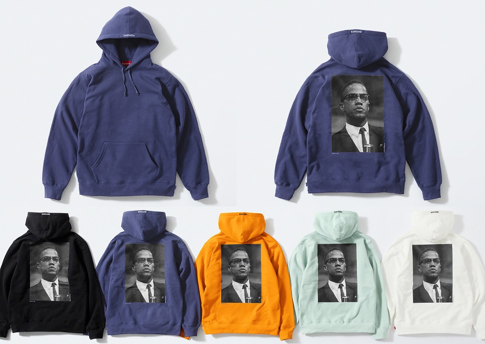 「マルコムX(1964年撮影)」のポートレイトを落とし込んだフーディ(上)とフォトTシャツ(中)