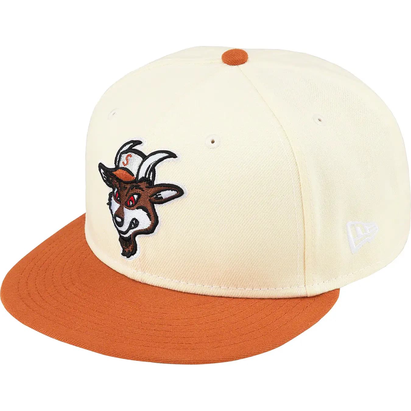 Sロゴキャップを被った山羊のグラフィックを刺繍した、2トーンカラーのニューエラ製59フィフティキャップ。