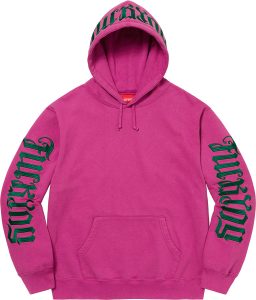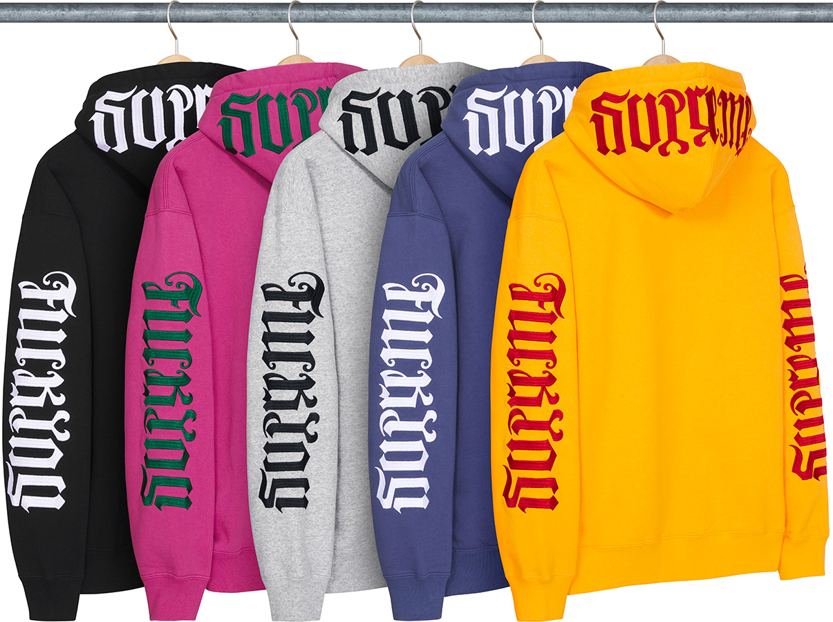 シュプリームを逆さまから読むと「ファックユー」に読めてしまう、逆さ文字(アンビグラム)を両袖とフードに刺繍した、タトゥーアーティスト「マーク・パルマー」デザインのフーディ。コットンフリース素材。