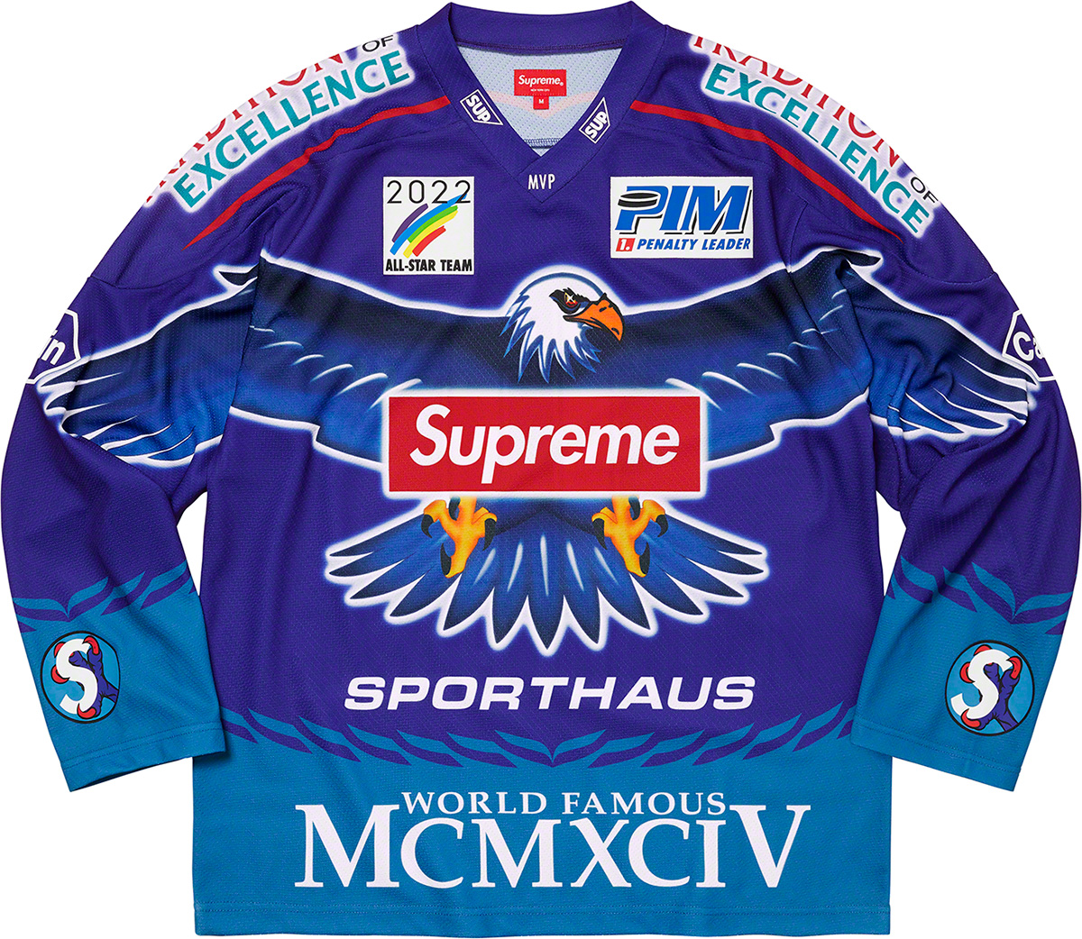ボックスロゴを抱いた鷲が大きく羽を広げたグラフィックが印象的な、ポリメッシュ素材のホッケージャージ。