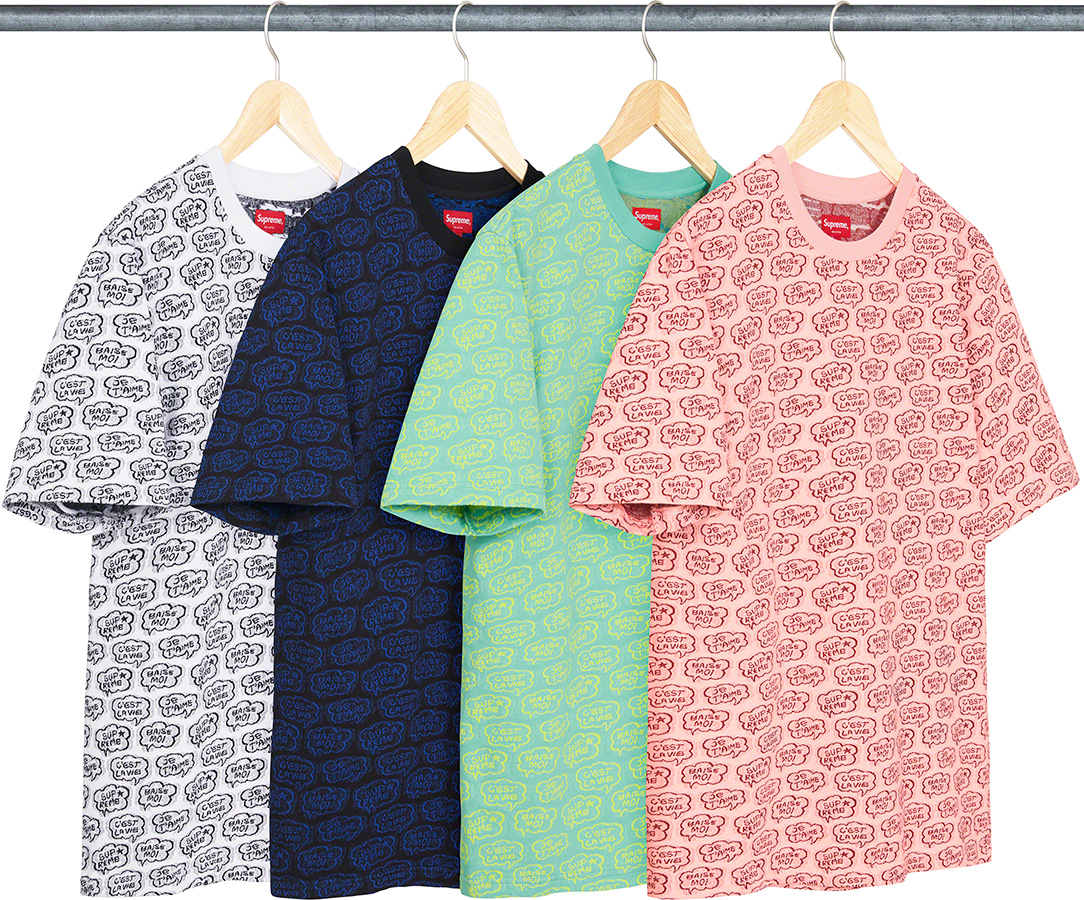 吹き出しにフランス語のテキストをジャカード織したコットンTシャツ。