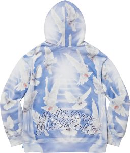 平和の象徴であるハトが、光の中を飛び交うアートワークを総柄で描いた、コットンフリース素材のフーディ。袖とバックのロゴは刺繍。