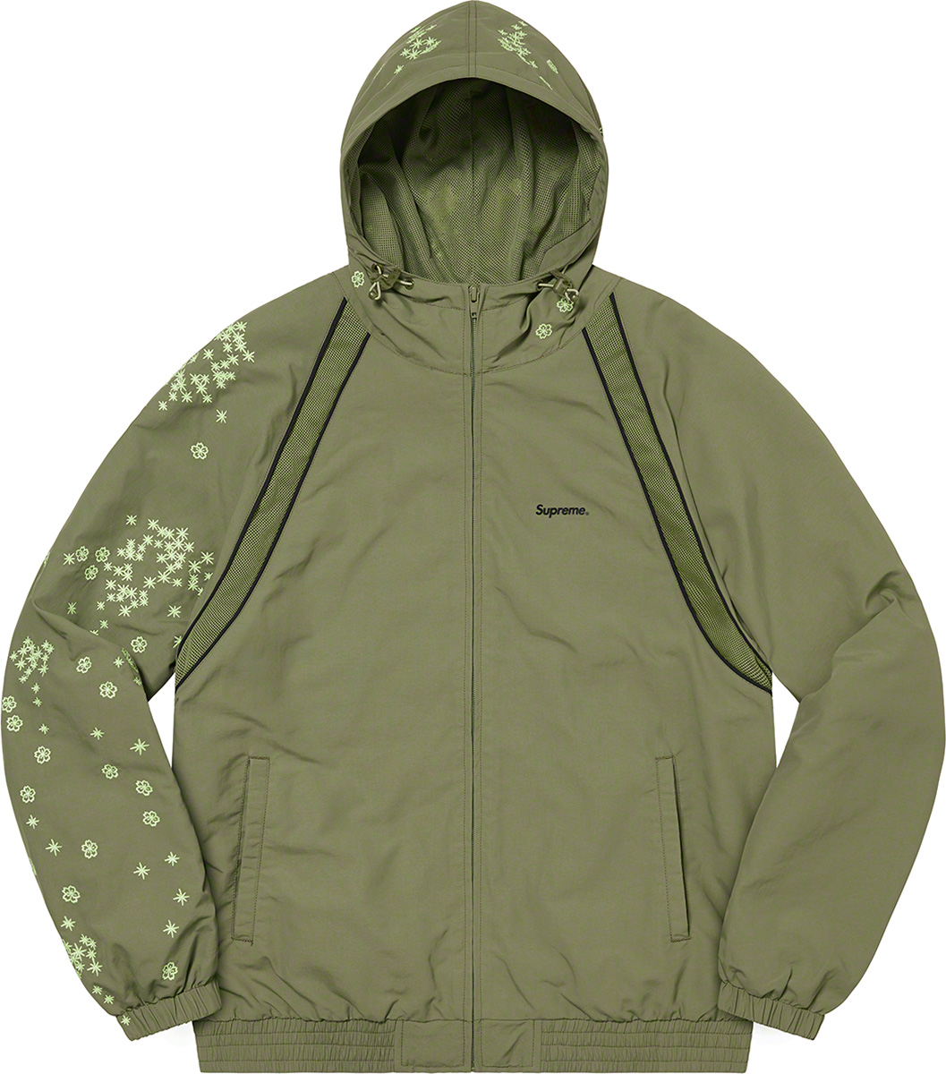 日本の刺繍メーカー「葵産業」が、暗闇で光る特殊な蓄光糸でアートワークをデザインした、サプレックスナイロン素材のトラックジャケット。