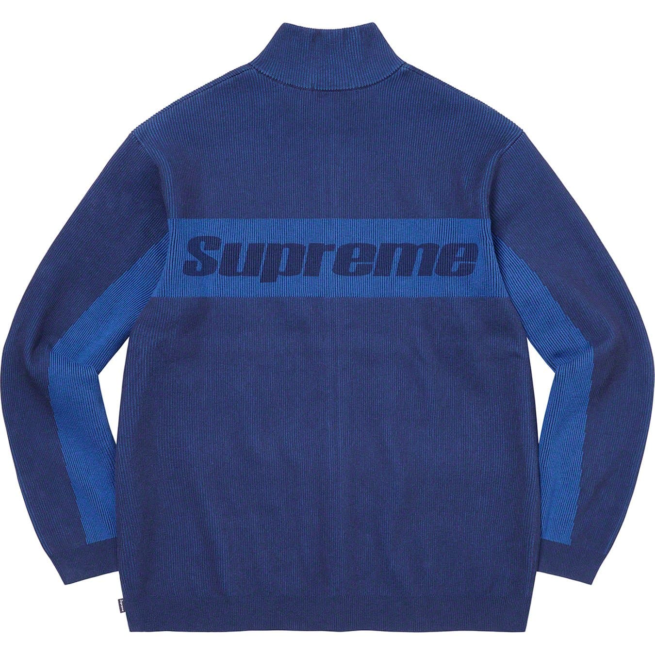 チェストのライン切り替えがスポーティな、リブ編みのジップアップセーター。