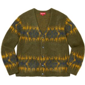 チェストとボトムにトライバル模様のような抽象的な柄をデザインしたモヘアカーディガン。