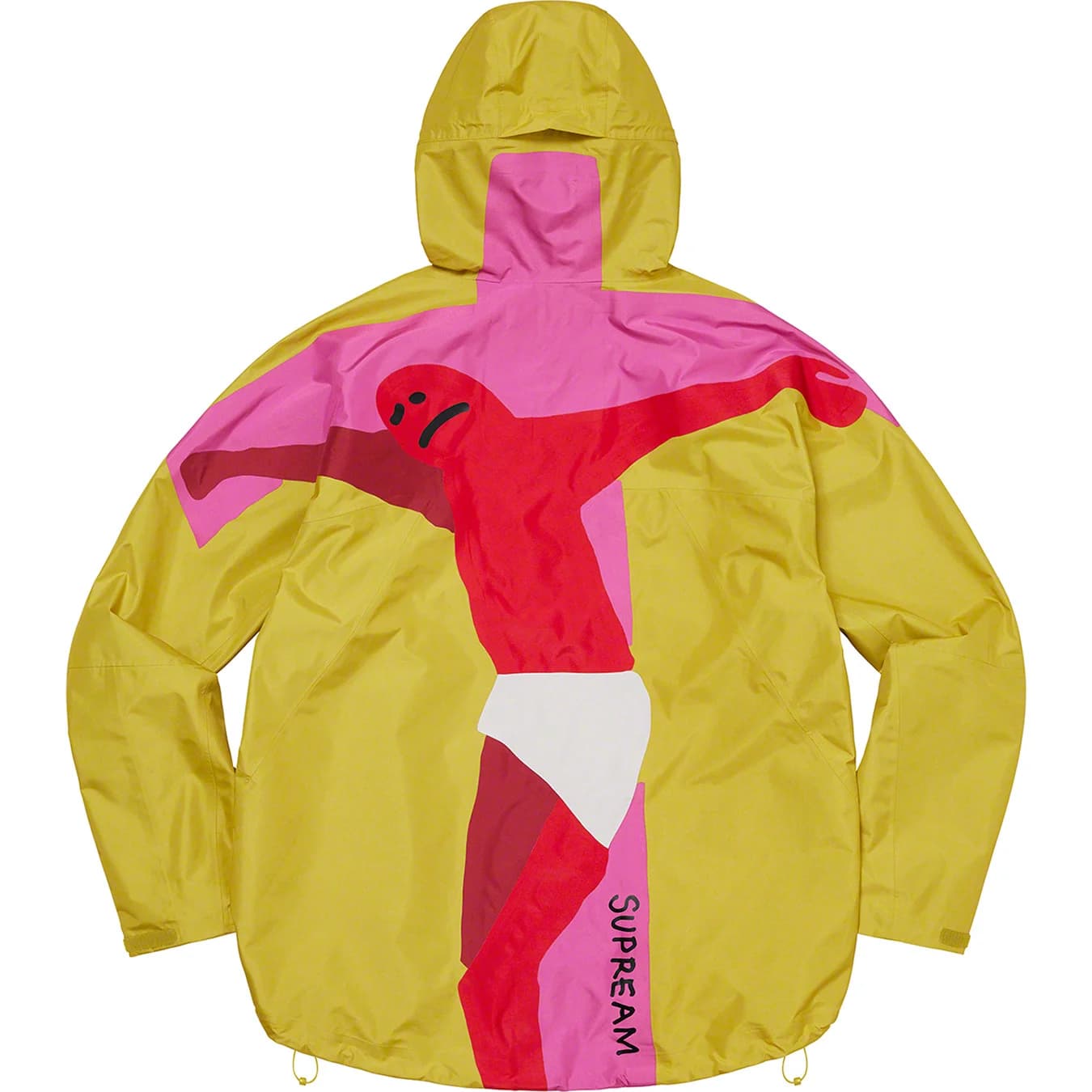 「磔となったイエス・キリスト」をマーク・ゴンザレスらしいタッチで描いた、ゴアッテックスシェルジャケット。