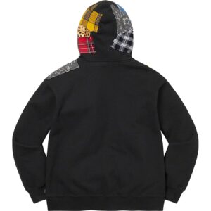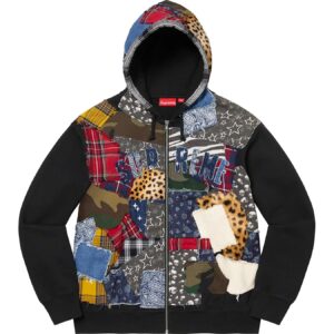 色々な柄の生地をパッチワークでつなぎ合わせたジップアップフーディ。