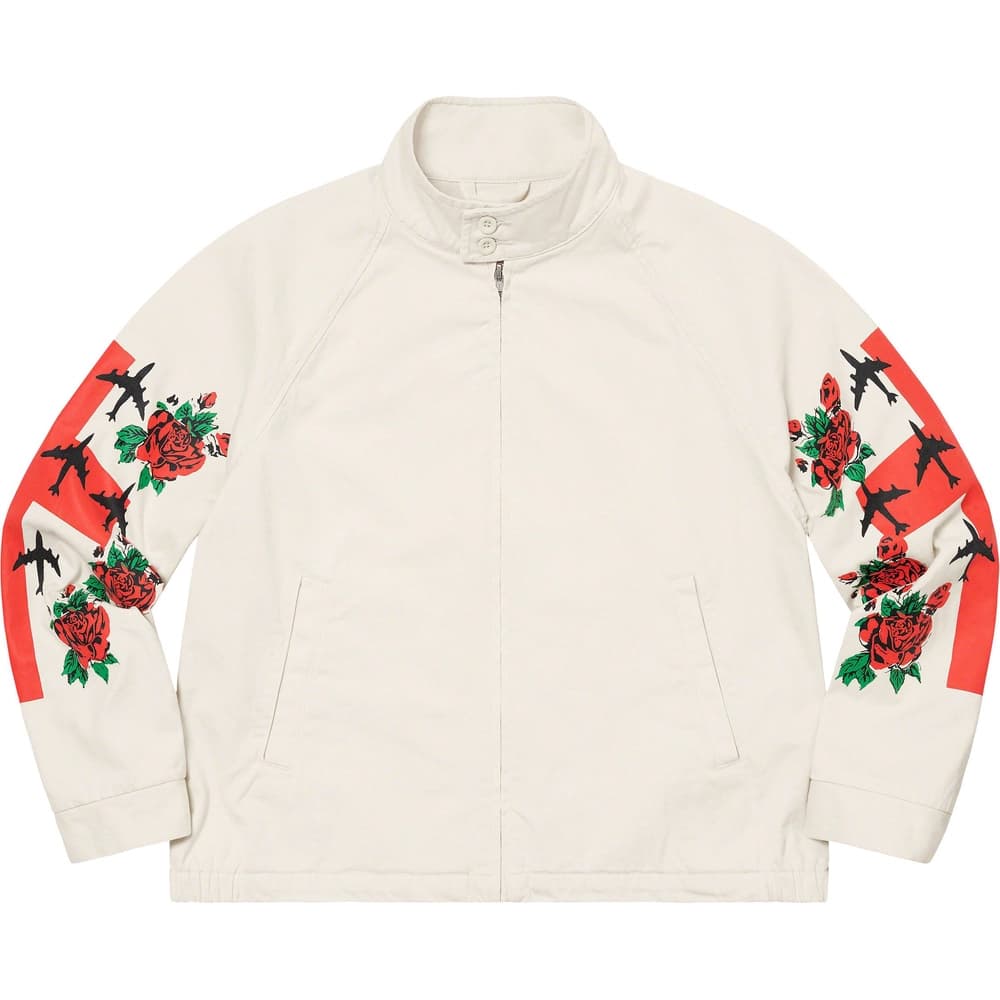クロスとバラ、飛行機をプリントしたコットンツイル素材のハリントンジャケット。