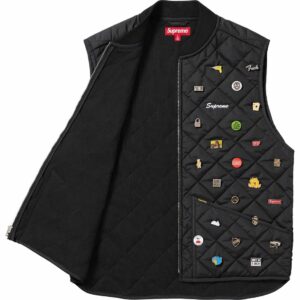 過去のアーカイブピンズを無数に散りばめたキルティングナイロンのワークベスト。