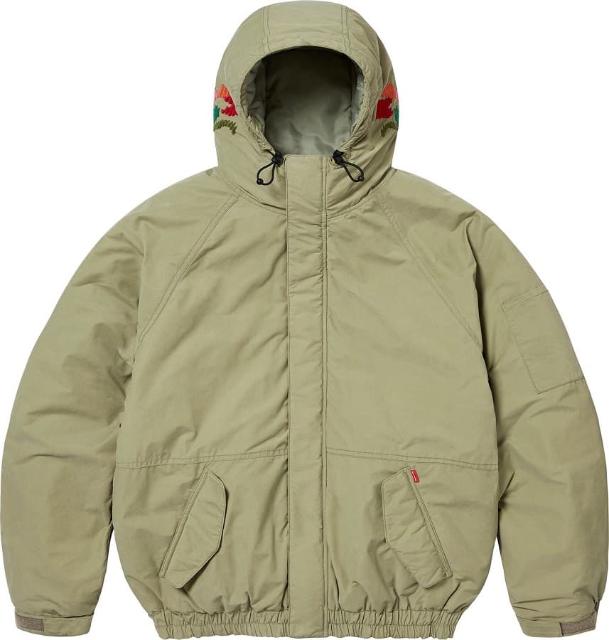 ニードルポイントで花柄を色鮮やかに刺繍した、中綿入りミリタリーフードジャケット。