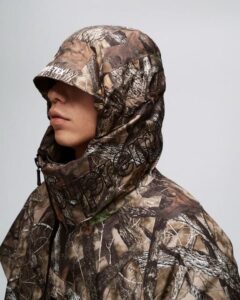 フェイクシアリングをパッチワークパターンで仕上げたジップアップフーディ。