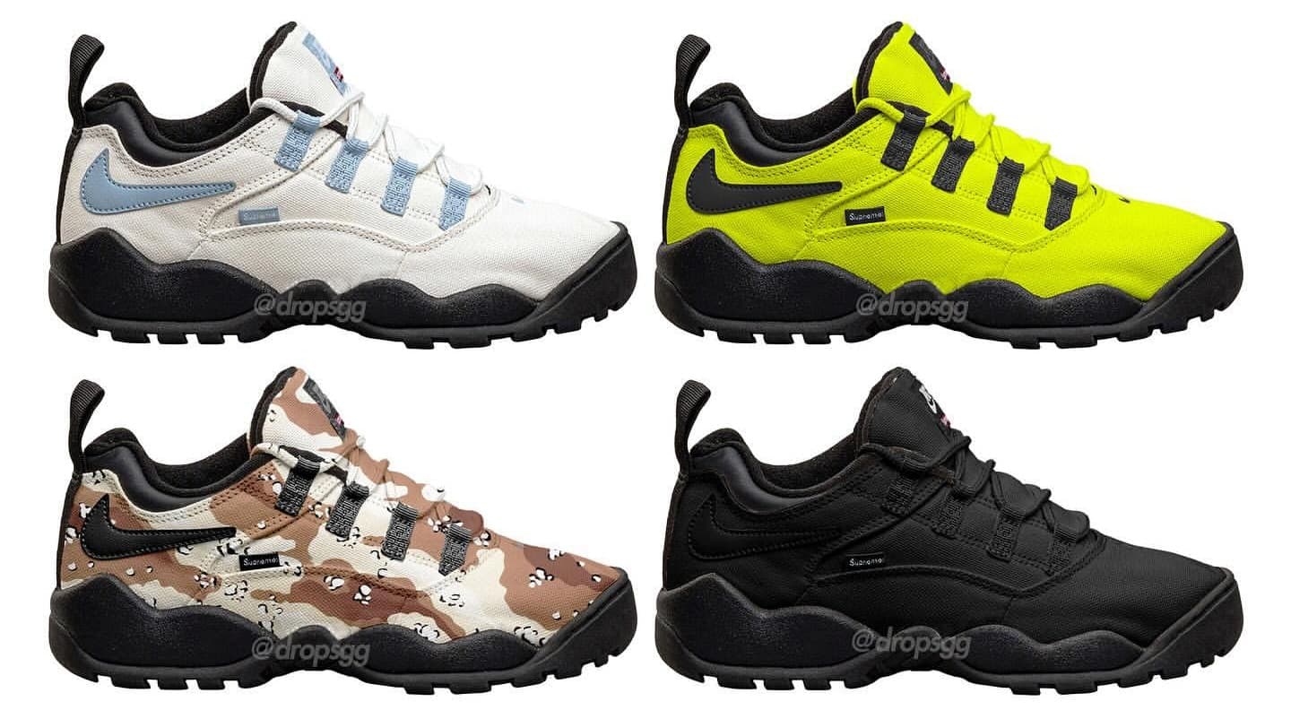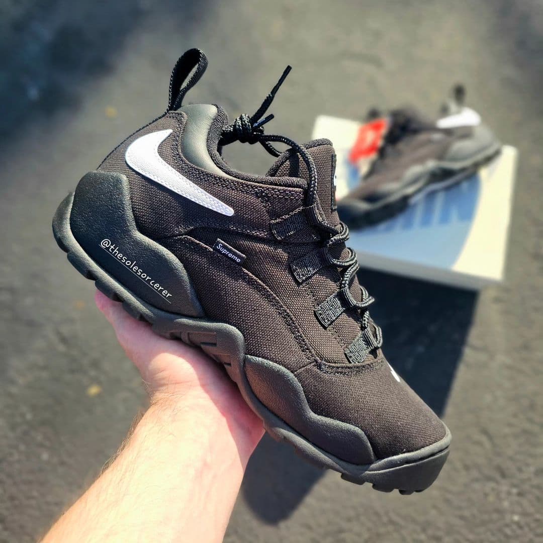 サイドパネルのシュプリームタグと、シュータンの赤いボックスロゴがコラボモデルを象徴する一足に仕上がっている。
