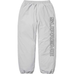 肩に大きくロゴを刺繍したサプレックスナイロン素材のトラックパンツ。