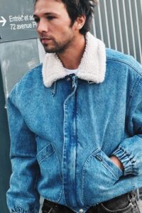バックにロゴを刺繍したシアリングデニムジャケット。フードは取り外し可能。
