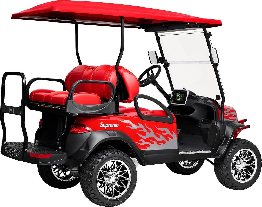 アメリカのゴルフカートメーカー「クラブカー」製、ボックスロゴやファイヤーパターンのデカールを貼ったリチウムイオンバッテリー充電式アルミ製4人乗りゴルフカート。14インチのクロームホイールとオフロードでも使用可能な215/50-R14 スチールベルテッドラジアルKleverタイヤを装着。最高時速約30.6km/h、大きさ約290cm×126cm×204cm、重量約406kg。アメリカ製。