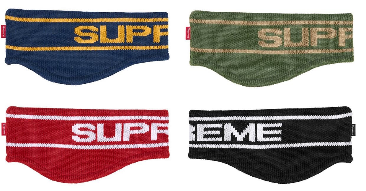 ロゴを大きく編み込んだヘッドバンド。