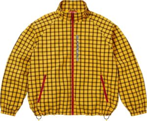 耐水サプレックスナイロン素材のミニチェック柄トラックジャケットと、セットアップのウォームアップパンツ。