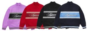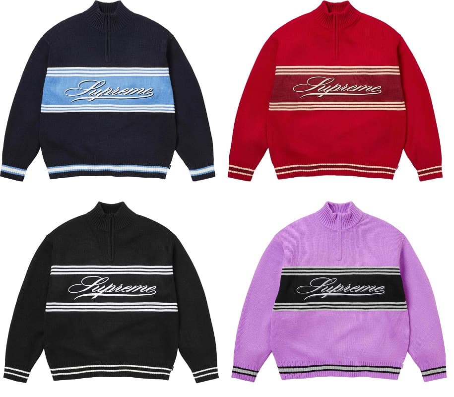 チェストストライプにスクリプトロゴを編み込んだスタンドカラーのハープジップアクリルセーター。