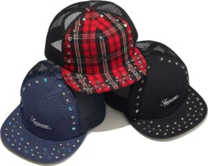 「B.B.サイモン」による、スタッズとラインストーンで装飾したスクリプトロゴ刺繍のメッシュバック5パネルキャップ。