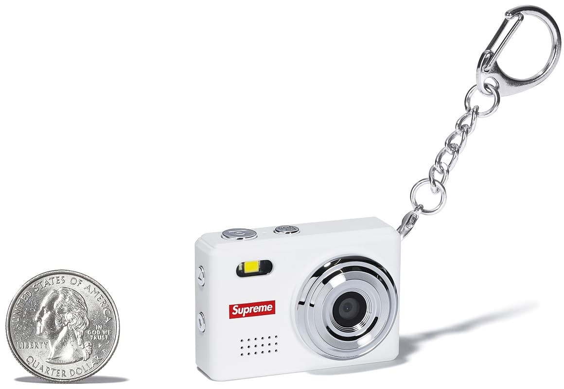 ボックスロゴをプリントしたキーチェン型のウルトラコンパクトデジタルカメラ。32GBTFカードとUSB-Cコードが付属、大きさ約4.9cm×2.9cm×2.8cm