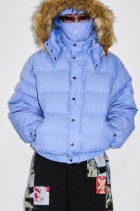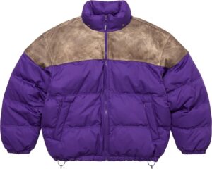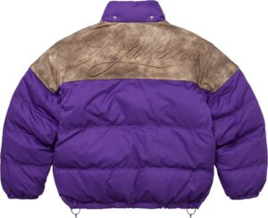 ヨーク部分をラムスキンレザーで切り替えた耐水ナイロン素材のパファージャケット。インサレーションにはプリマロフトを充填し保温性を高めてある。バックヨークロゴは刺繍。脱着可能なフード付き。