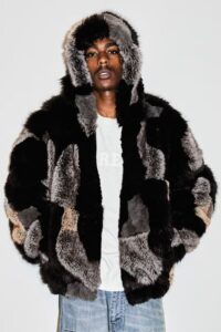 毛足の長いフェイクファーをパッチワーク状に縫い合わせたフードジャケット。裏地には防風性を高めるためウインドストッパーを採用。バックネックにメタルプレート付き。