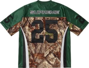 光沢のあるポリエステル素材のリアルツリーカモフットボールジャージ。ピンクリボン運動のチャリティーアイテム。