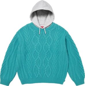 ケーブルニットにスウェット素材のフードを組み合わせたウールブレンドセーター。