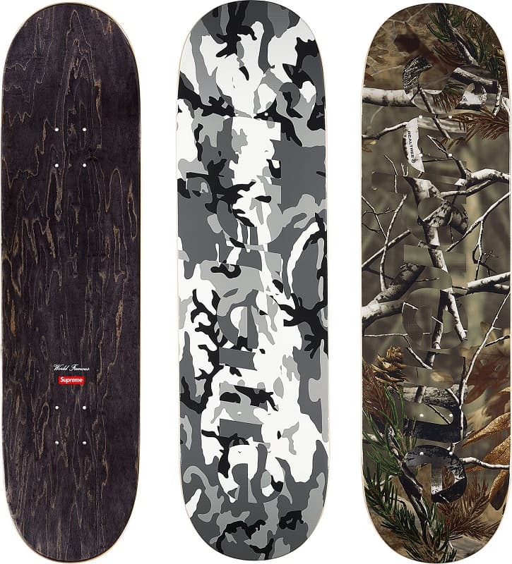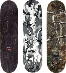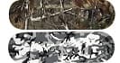 ロゴがカモ柄の中に溶け込んだようなデザインのスケードボードデッキ。
