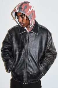 ビンテージ加工を施したカウハイドレザーのショット製レーサージャケット。チェストのロゴは型押し、アメリカ製。