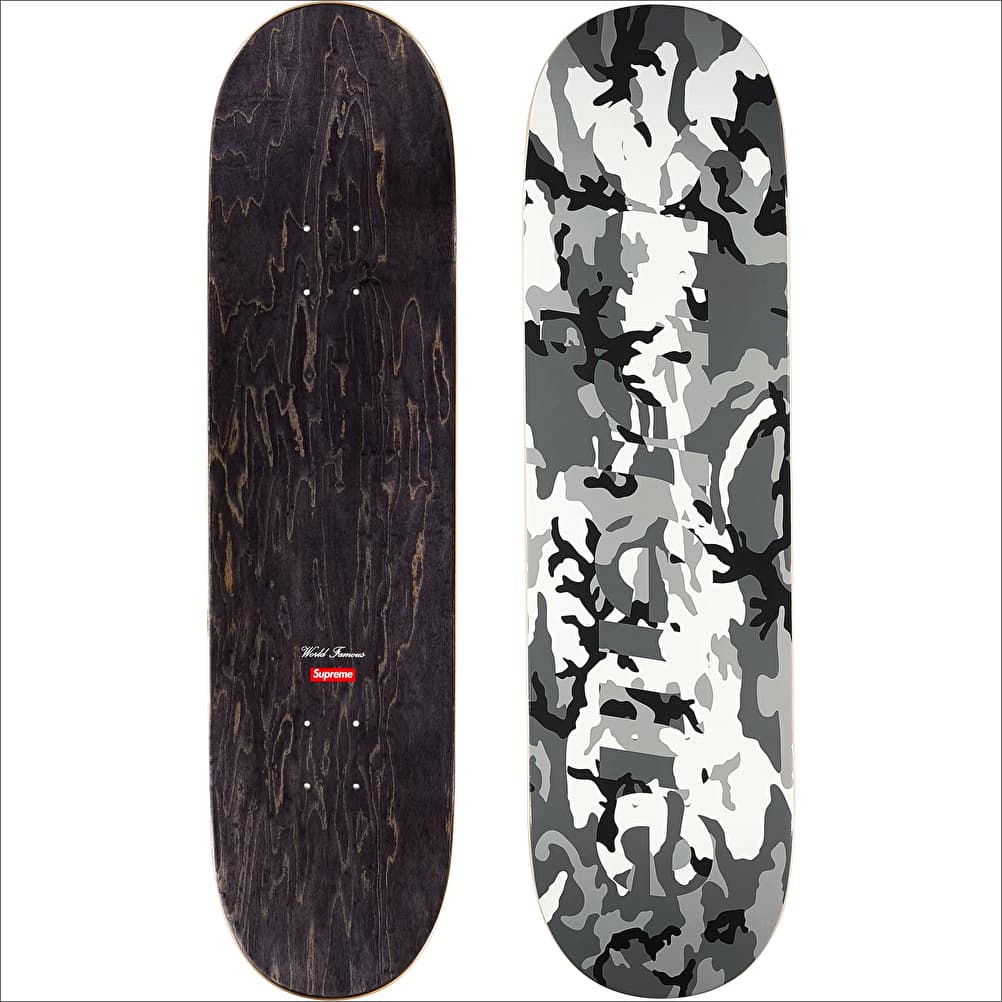 ロゴがカモ柄の中に溶け込んだようなデザインのスケードボードデッキ。