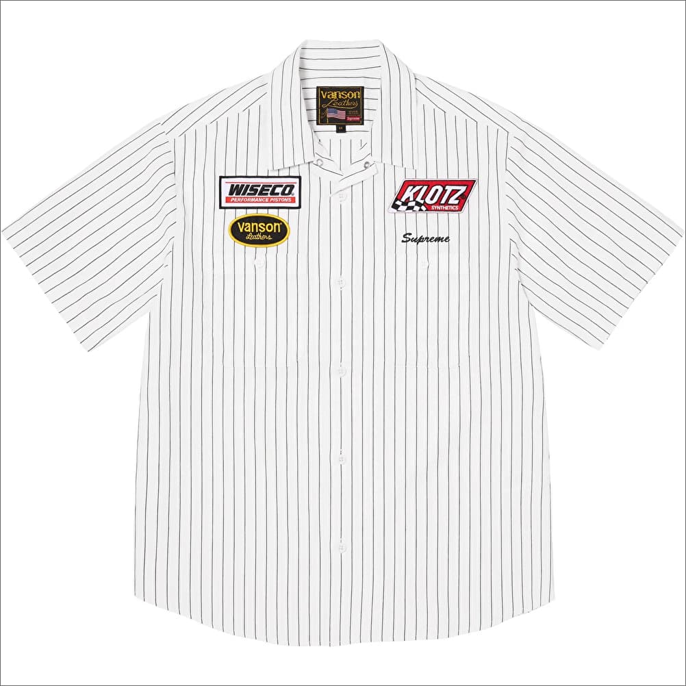 バンソンレザーズ製、モータスポーツ企業のアップリケで装飾したワークシャツ。コットン素材。