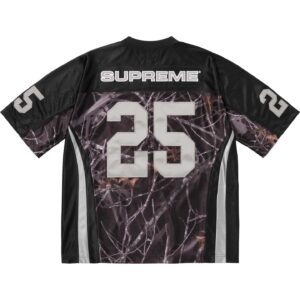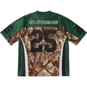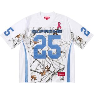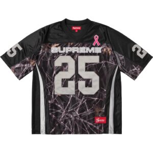 光沢のあるポリエステル素材のリアルツリーカモフットボールジャージ。ピンクリボン運動のチャリティーアイテム。